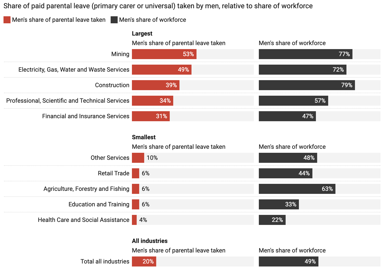 While mining is the industry with the largest share of paid parental leave being taken by men (53%), it’s still well below men’s 77% share of the industry.